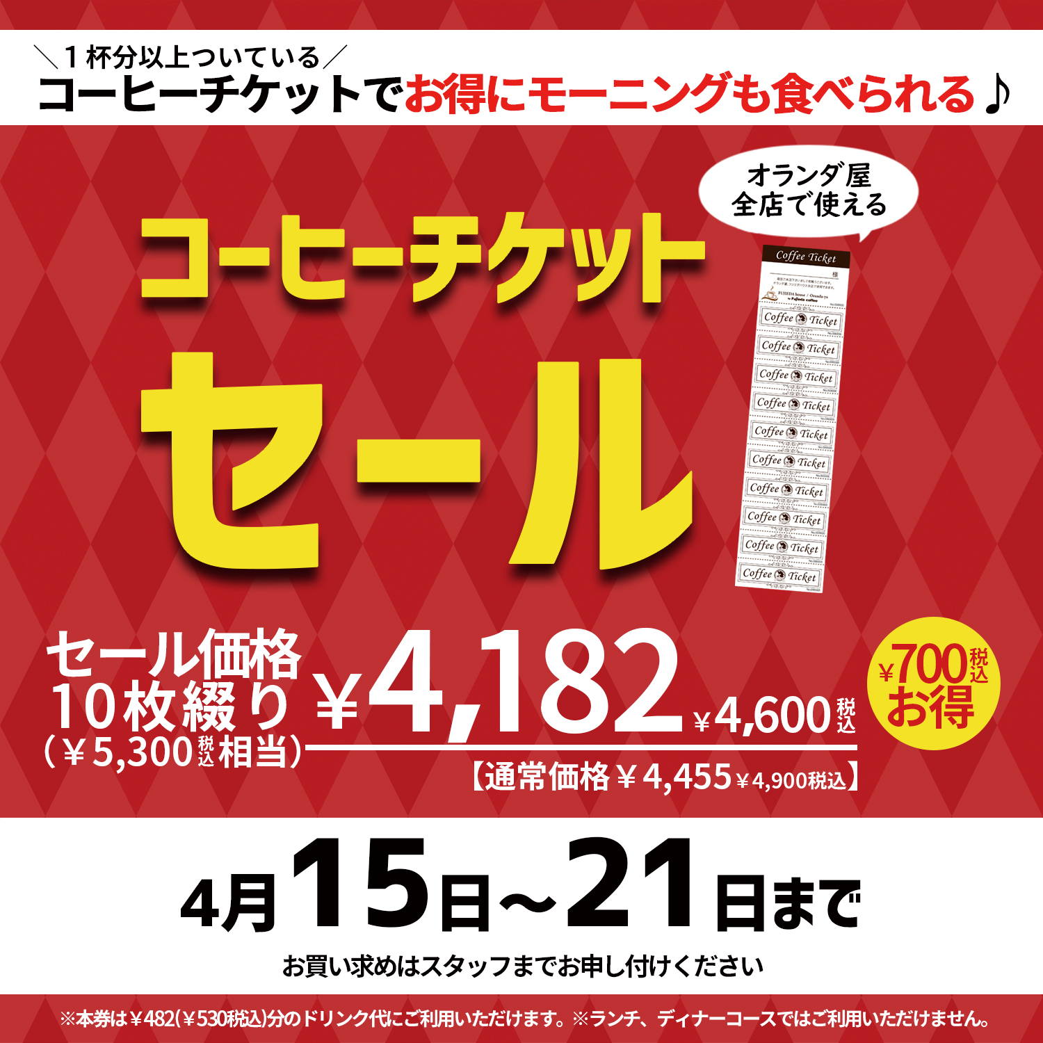 700円(税込)お得!コーヒーチケットセール4月開催!